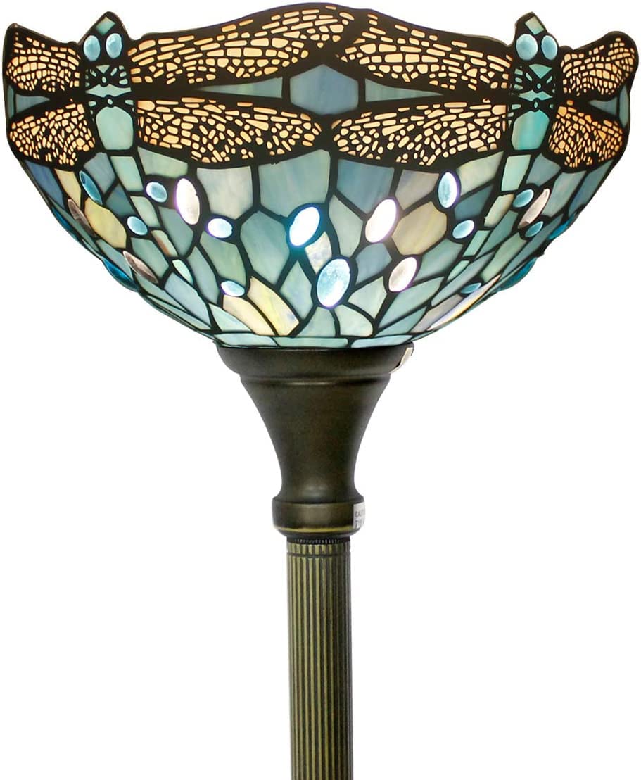 Flumy® - Tiffany Floor Lamp Sea Blue Stained Glass Dragonfly Light 12X12X66 Inches Pole Torchiere Standing Corner Torch Uplight Decor Bedroom Living Room Home Office