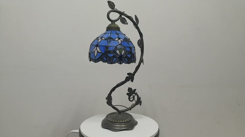 Flumy® - Tiffany Table Lamp Blue Purple Stained Glass Baroque Style Reading Desk Light, Metal Leaf Base 8X10X21 Inches Decor Small Space Bedside Bedroom Home Office